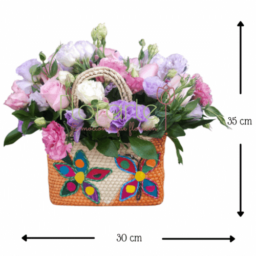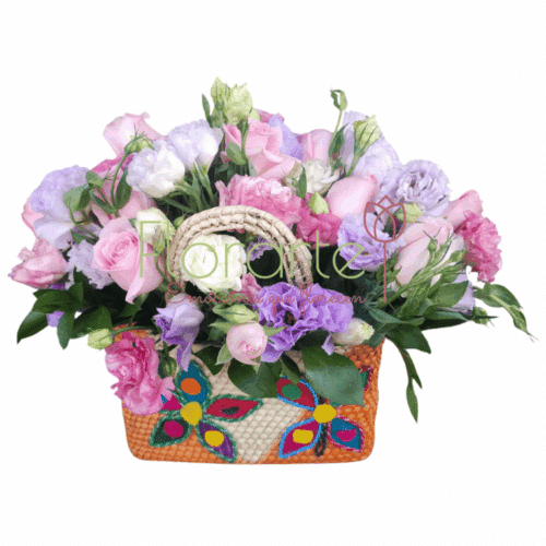 Este Día de las Madres, regala un pedacito de cielo a tu mamá con la exquisita selección de Florarte. Envía Flores que siempre recuerde con esta hermosa canasta de flores elaborada con 12 Rosas Caricia de invernadero entre Lisianthus Lila y Rosa en nuestra elegante y hermosa bolsa tejida con un detalle de flores en la misma.