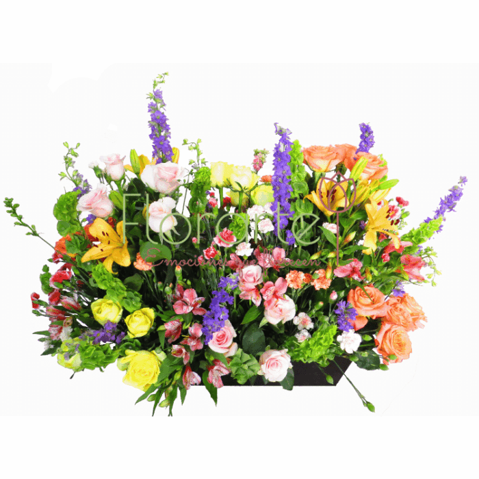 Envía este hermoso y festivo arreglo jardín de flores tres docenas de Rosas, una docena en tono rosado, una docena en tono naranja, una docena en tono amarillo, más una decena de tallos de Espuela en tono azul, dos decenas de Clavellinas en tonos moteados y rosados, flores de Campanilla Irlandesa y cuatro tallos de flores de Lilis en una jardinera de madera.
