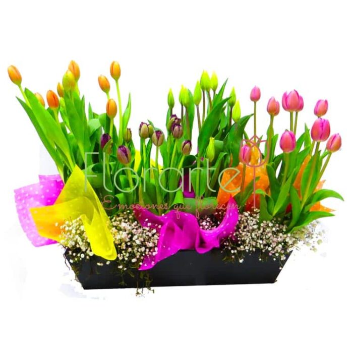 ¡Envía flores que la sorprenderán! Arreglo de 40 bellos Tulipanes en tonos variados, entre flor baby y papel coreano de colores en una jardinera de MDF tono chocolate.