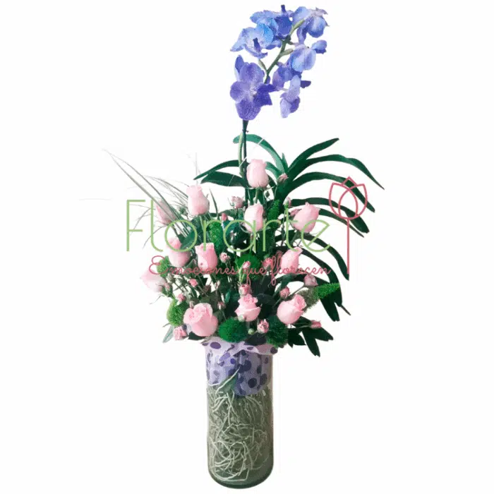 Envía flores que dejan huella, una Planta de Orquídea Vanda en tono lila, entre una docena de Rosas hermosa y Minirosa en color rosa acompañada de Green y Cola de Zorro en un cilindro de vidrio decorado con papel.