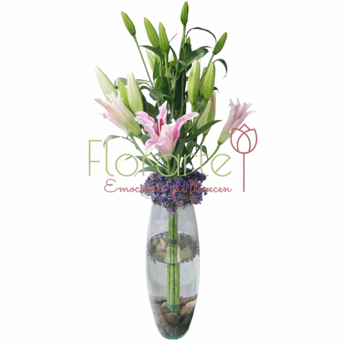 ¡Las flores a domicilio que le encantaran! Que su sonrisa aflore al recibir este arreglo elaborado con media decena de tallos de flores orientales Acapulco, en nuestra base París, entre flores de Espuma azúl, fondeada con piedras pulidas.