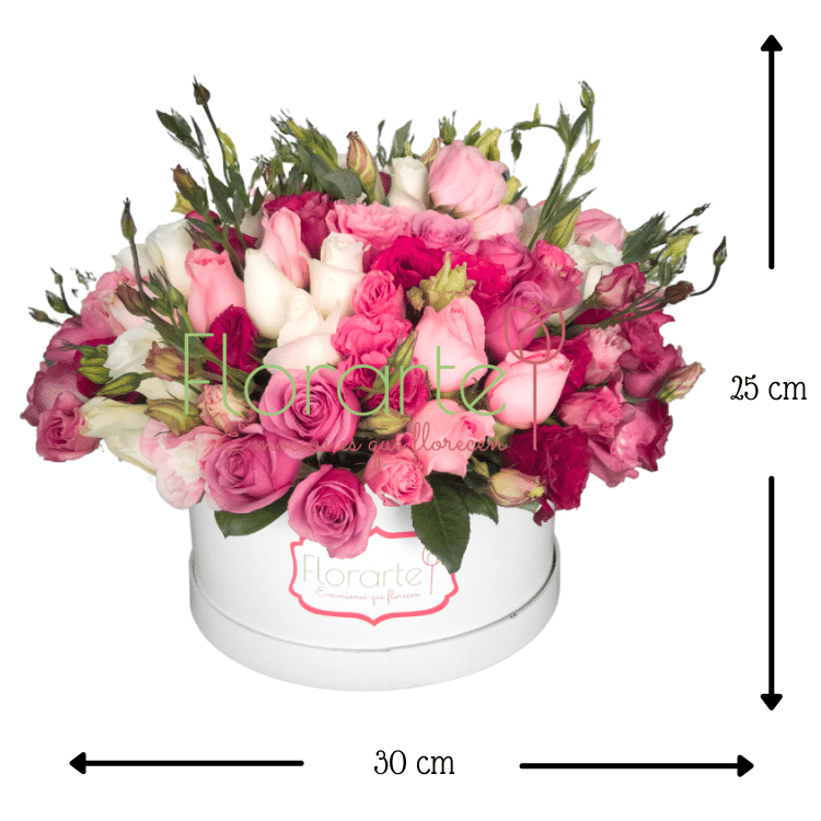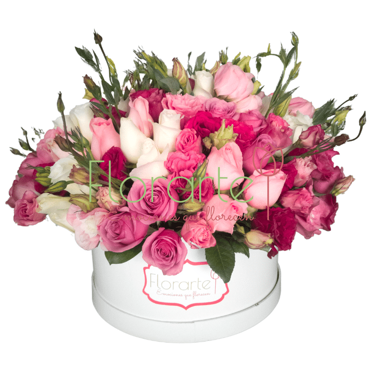Envía Flores que enamoren a la primera mirada, precioso arreglo Vintage, 45 Rosas de invernadero de primera calidad, en color lila, rosa y blanco, una decena de Lisianthus en rosa y otra decena en tono vino en nuestra caja cilíndrica vintage.