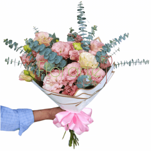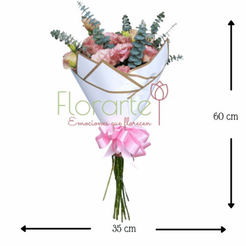 ¡Regala flores, sus preferidas sólo en Florarte! Precioso y elegante ramo elaborado con flores de Lisianthus rosa y un toque de Dólar para un constraste perfecto, papel blanco y un moño de tela rosa.