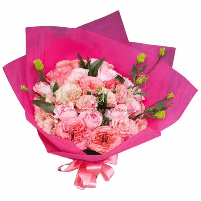 A veces sólo necesitamos que nos envien flores aunque no sea una fecha especial. Regala flores a domicilio con nuestro elagante ramo elaborado con 10 tallos de Lisianthus rosa, 1 decena de Rosas Inglesas en tono rosa y 1 docena de Rosas de invernadero rosas abrazadas por papel en tono sandia y un moño de tela rosa.