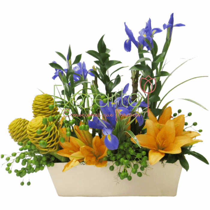 Envía flores que llenan de vida su día. Obsequía este alegre y elegante arreglo elaborado con media docena de Iris, 2 tallos de Lilis naranjas entre Impericum verde, Ruscus y Maracas amarillas en una base tipo jardinera de cerámica blanca.