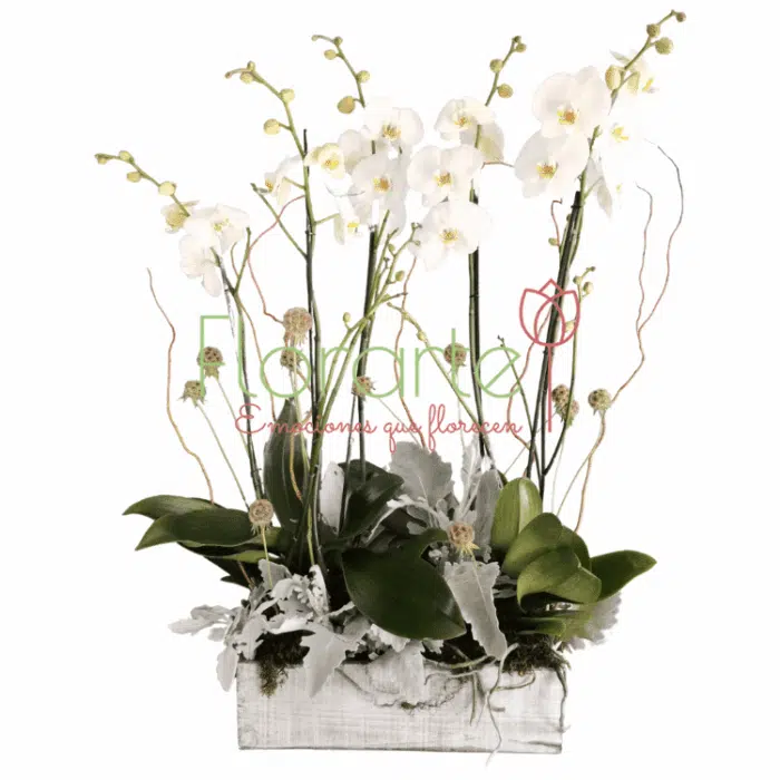 ¡Regala flores bellas como las orquídeas que son flores dignas de ser un hermoso regalo, engloban lo bello! Tres preciosas Orquídeas Phalaenopsis doble tallo en tono blanco, acompañadas con hermoso follaje Miller, varas vivas de Curly Willow y Escabiosas, en nuestra maceta artesanal de madera envejecida tipo jardinera.