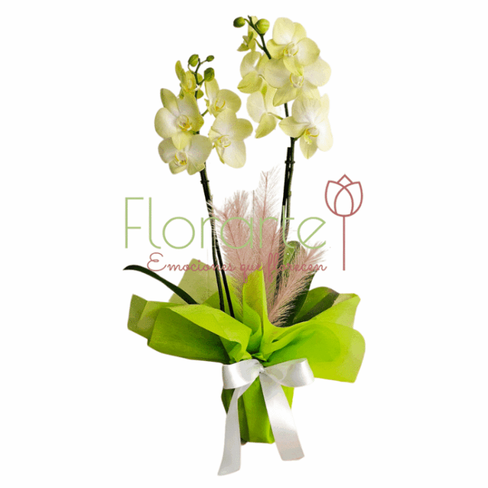 Esté día de dar flores amarillas, que no te separe el trabajo ni la distancia, envía flores que la harán feliz. Bonita planta de Orquídea Phalaenopsis doble tallo en tono amarilla verdosa acompañada finos follajes, envuelta con papel coreano y un atado de listón. Una belleza que le encantará. Duración de un mes o más, siguiendo los cuidados.