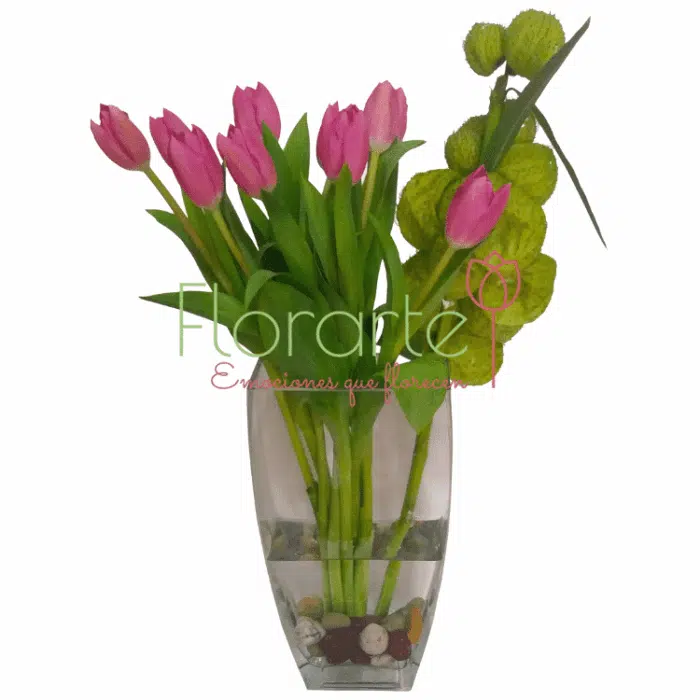 Regala flores hermosas de Tulipanes que simbolizan juventud y feminidad. Arreglo elaborado con una decena de Tulipanes en color barcelona acompañado de una Vara de Bobis en una base fina de Vidrio fondeada por piedras de rio.