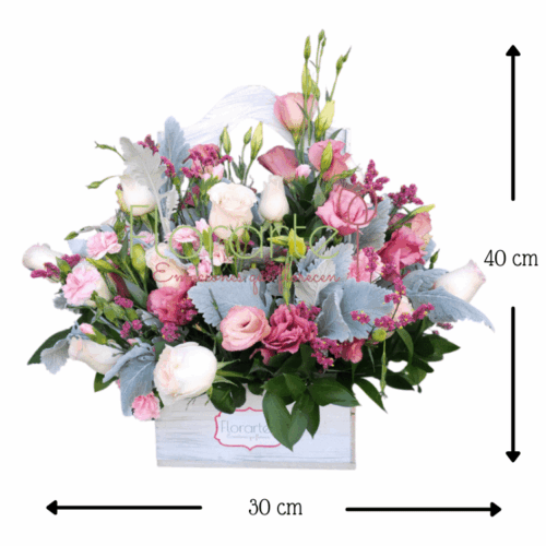 Demuéstrale a mamá cuánto la quieres con un regalo tan único como ella: un arreglo floral de Florarte. ¡Ordénalo hoy mismo y haz de este Día de las Madres un momento inolvidable! Envía Flores hemrosas con esta canasta elaborada con 18 Rosas Señorita entre Lisianthus Rosa, Clavel rosa, Miller y Statis rosa en nuestra canasta de madera en tono blanco.
