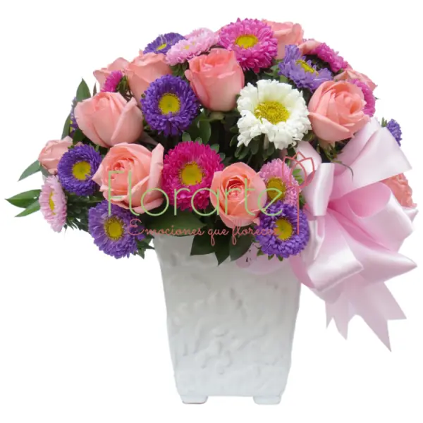 ¡Envía flores preciosas en su mejor contraste! Elegante arreglo elaborado con 15 Rosas de Invernadero entre flores de Matsumoto de colores y Ruscus en nuestra base de cerámica y un moño de tela.