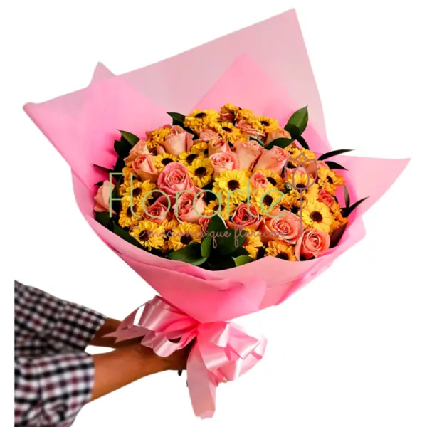 Regala flores hermosas que le sorprendan. Ramo bonito elaborado con 2 docenas de Rosas en tono rosa entre flores de Vikingos con papel decorativo.