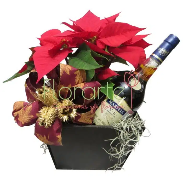 Obsequia este botella de Martell V.S. Cognac Martell VS (Very Special) 700 ml, añejado en barricas de roble francés durante 3 años, su sabor exquisito afrutado con notas a madera y color dorado le encantará. Encuentra Cognac Martell VS 700 ml. Acompañado con Nochebuenas y elementos de temporada, perfecto para desear una feliz navidad y un año prospero.