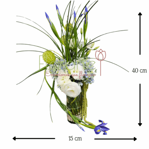 Con nuestro servicio de envía flores CDMX, llevamos tu regalo a cualquier rincón de la ciudad. Hazla feliz con este hermoso detalle de Flores elaborado con 6 Flores de Iris morado, un toque de Lisianthus blanco, Hortensia azul, Amaranto verde y Bombis con follajes en un florero de vidrio fondeado con piedras blancas y Curly Willow.