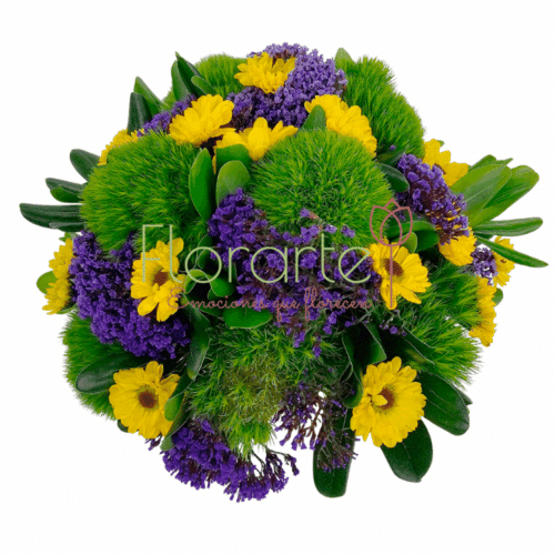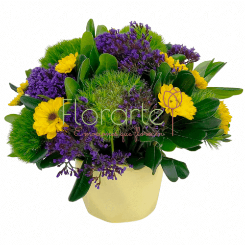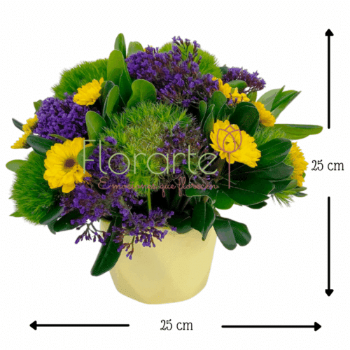 Esté 21 de septiembre “Día de las flores amarillas” regala amor y no dejes que sea protagoniasta. Precioso y delicado arreglo floral elaborado con Flores de Vikingos amarillos entre un toque de Green y Espuma morada en una elegante base de cerámica amarila. Es la forma perfecta de demostrarle tu cariño con un gesto único y memorable.
