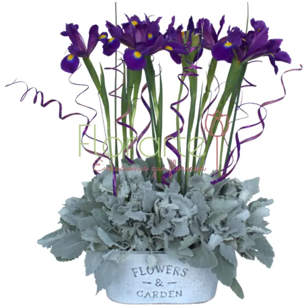 ¡Regala flores hermosas que simbolizan la elocuencia, la esperanza, la sabiduría, la comunicación y la fe! Precioso arreglo elaborado con una decena de Iris morado entre varas decorativas moradas y Miller al fondo en nuestra base de cerámica Flowers and Garden.